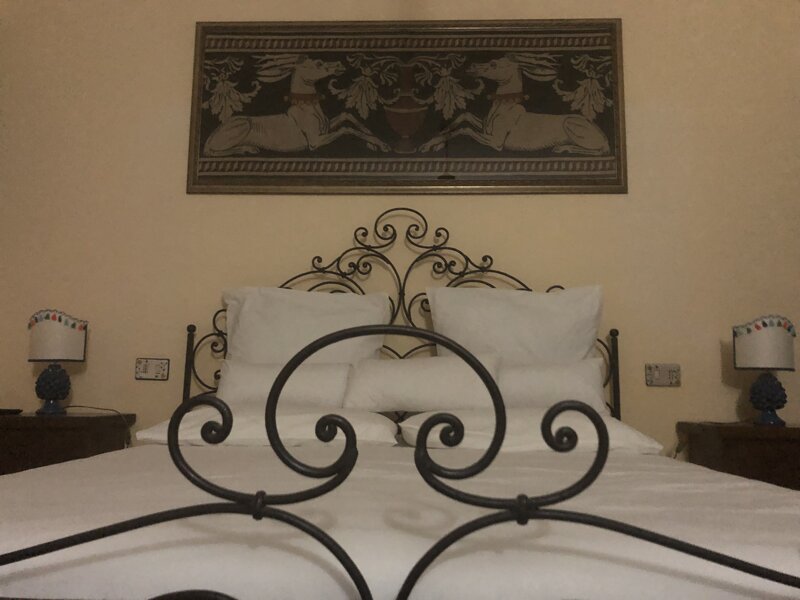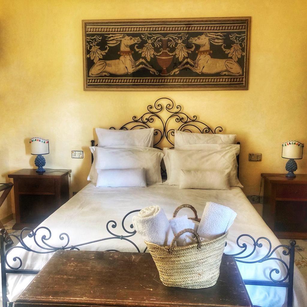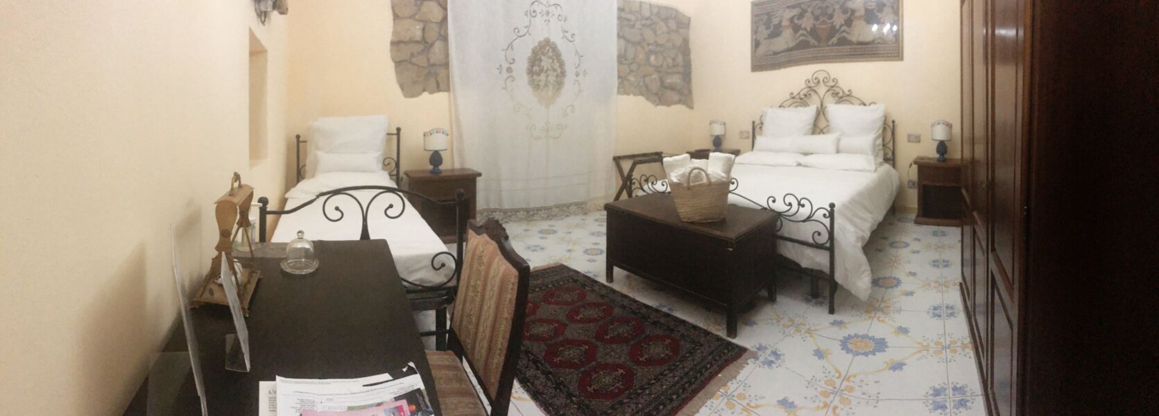 Una camera che vi sorprenderà; potrete ammirare un antico arazzo che la famiglia Milio acquistò a Siena nel 1800; mobili originali dell’800, pregiate ceramiche siciliane, muri con pietra a vista, pavimenti con decori siciliani.