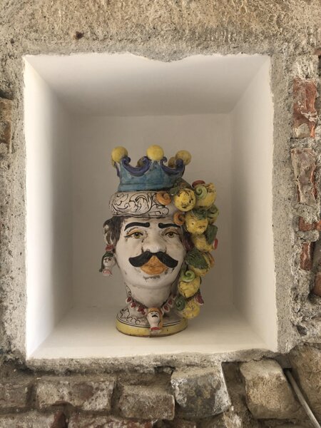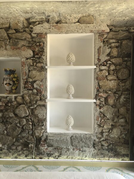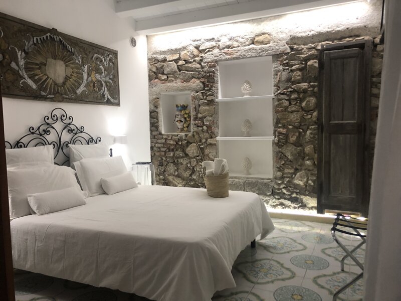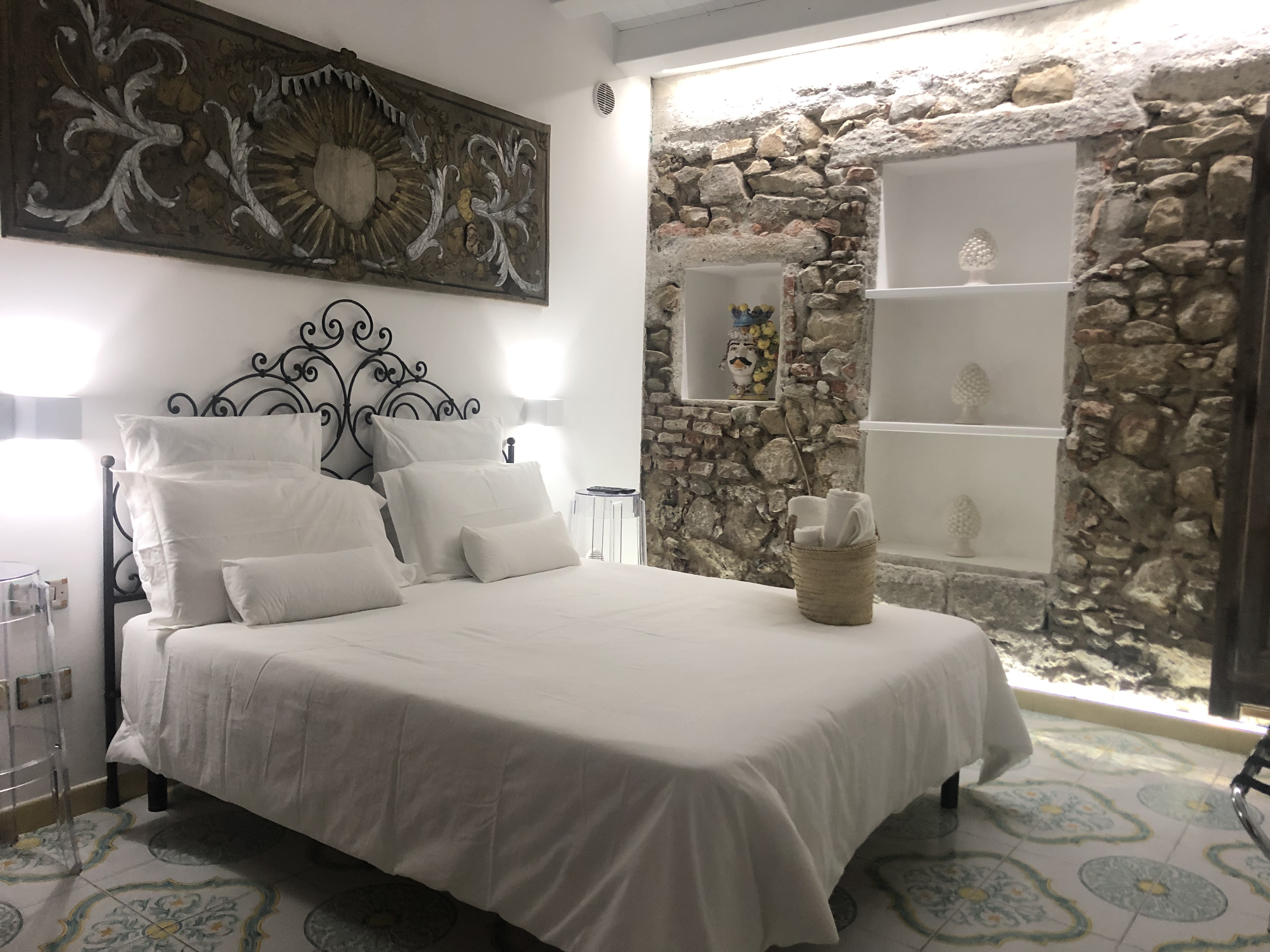 Dalla finestra potrete affacciarvi sul cortile e sulla vallata ammirando infuocati tramonti e il faro del porto dell’Isola di Filicudi. La camera è arredata con arazzo del ‘700 in filo d’argento, con la testa di Moro realizzata da un maestro ceramista di Caltagirone. I pavimenti sono realizzati in ceramica con decori siciliani.